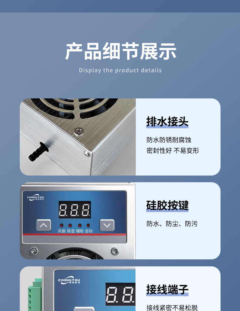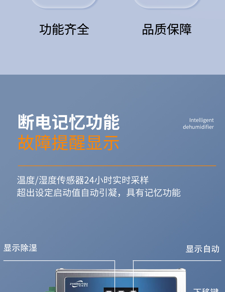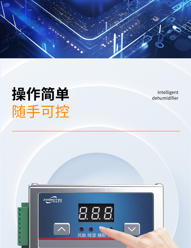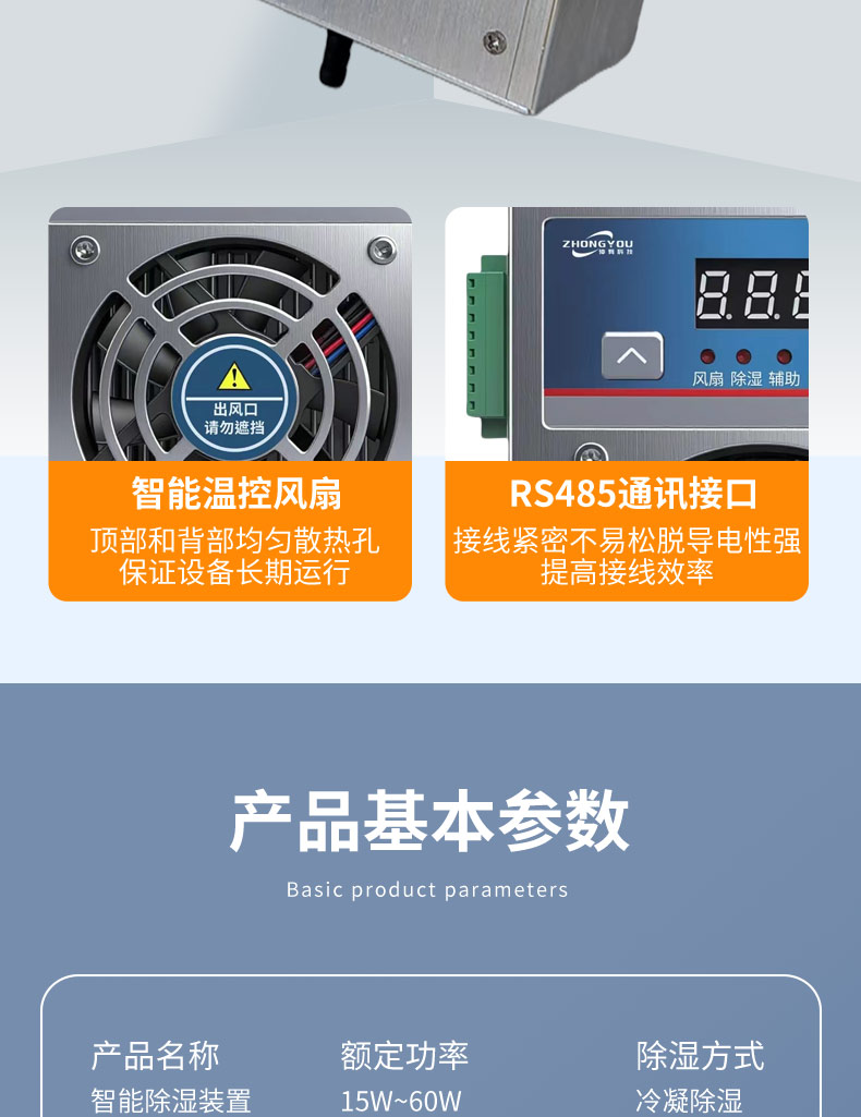 2.智能控制:内置高精度温湿度传感器,自动监测柜内环境。支持 阈值调节(如湿度>65%自动启动),节能省电。
