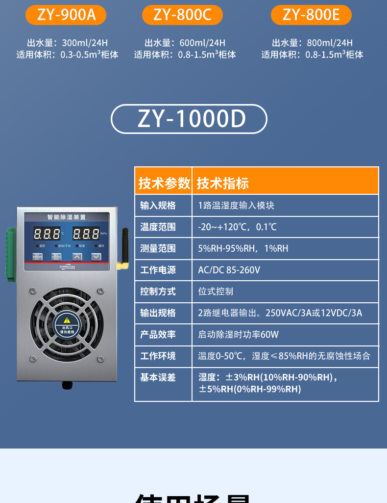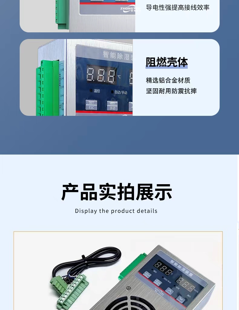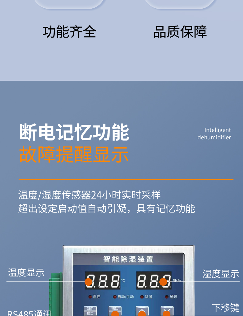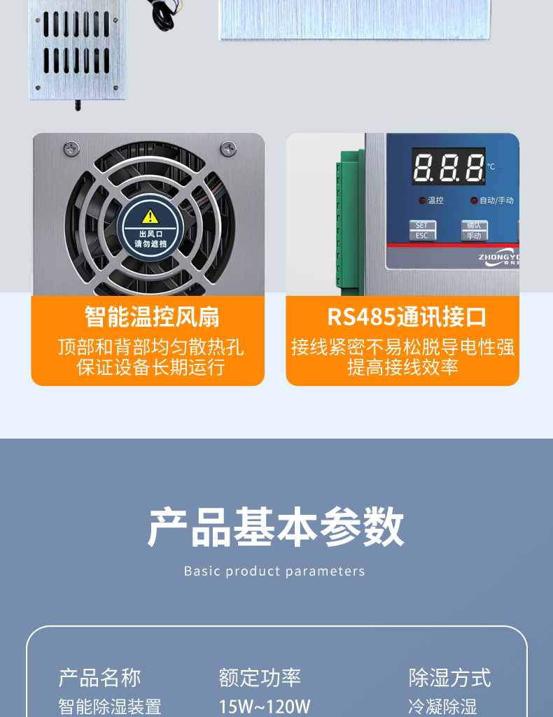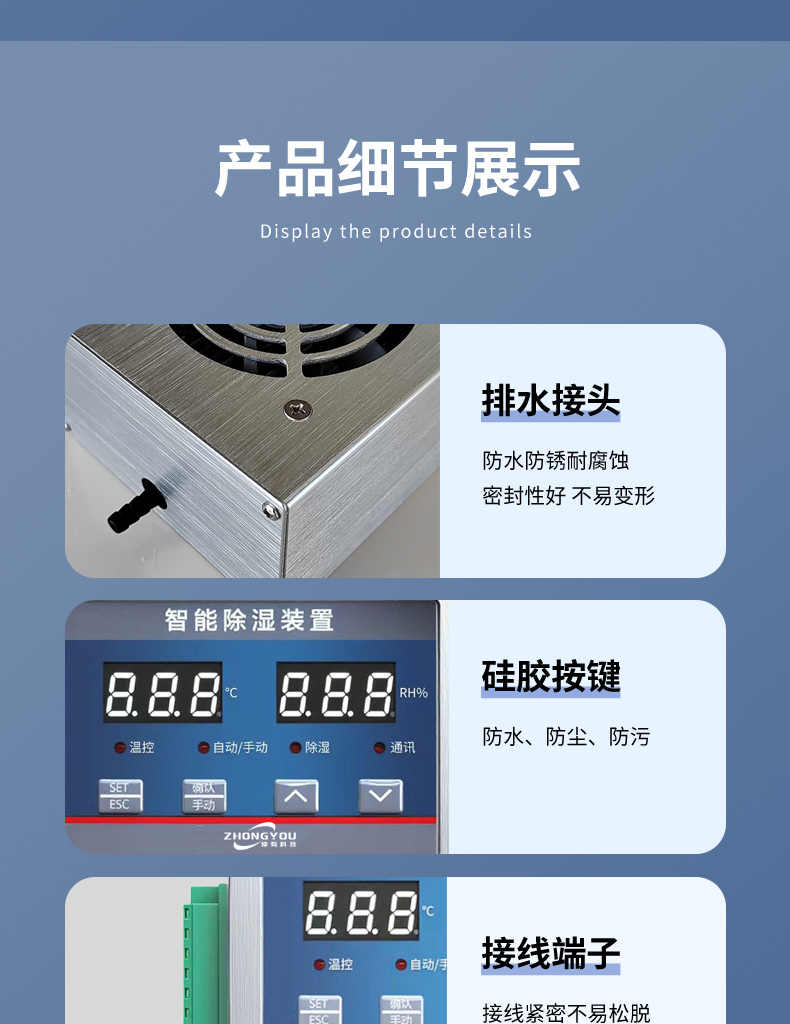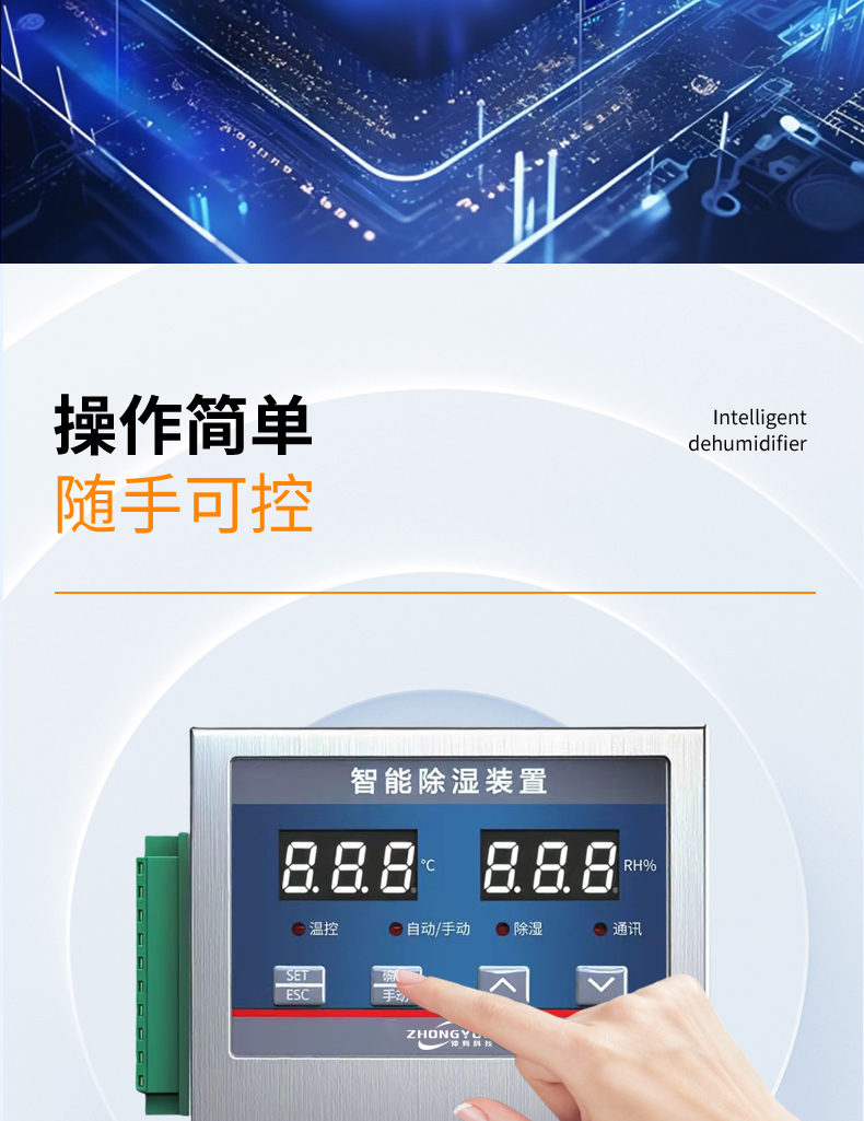 2.智能控制:内置高精度温湿度传感器,自动监测柜内环境。支持 阈值调节(如湿度>65%自动启动),节能省电。